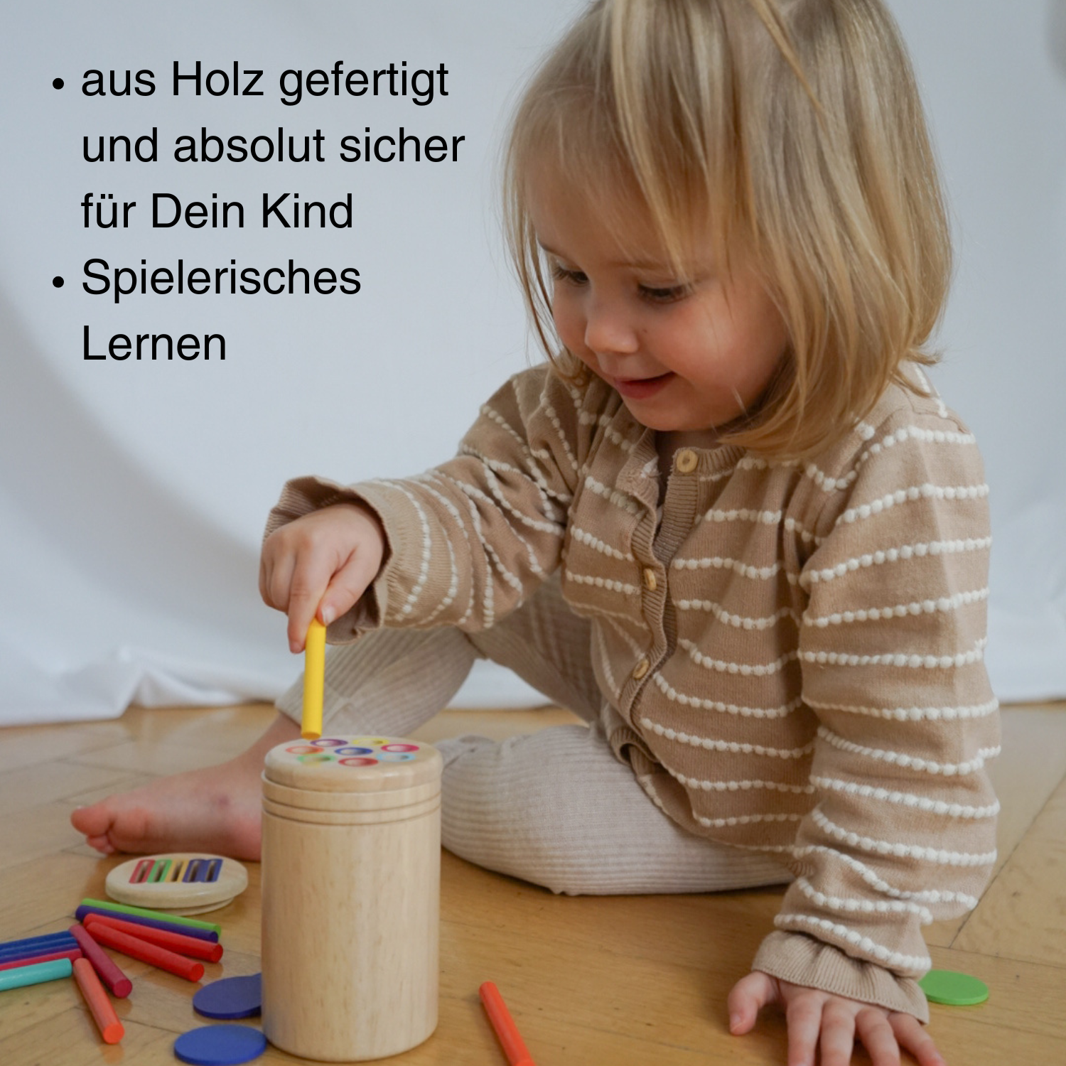Entdecken Sie unser Montessori Holzspielzeug, das speziell entwickelt wurde, um die Feinmotorik Ihres Kindes auf spielerische Weise zu fördern. Dieses bunte und ansprechende Spielzeug besteht aus verschiedenen Stäben und Chips, die Kinder in einen stabilen Holzbecher stecken können. Es bietet nicht nur eine kreative Möglichkeit für Kinder, ihre motorischen Fähigkeiten zu entwickeln, sondern fördert auch die Konzentration und das Problemlösungsvermögen. Kinder werden es lieben, ihre eigene kleine Welt mit lebendigen Farben und abwechslungsreichen Formen zu gestalten. Lasse Dein Kind beim Spielen lernen und die Freude am Entdecken erleben!